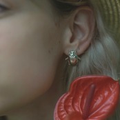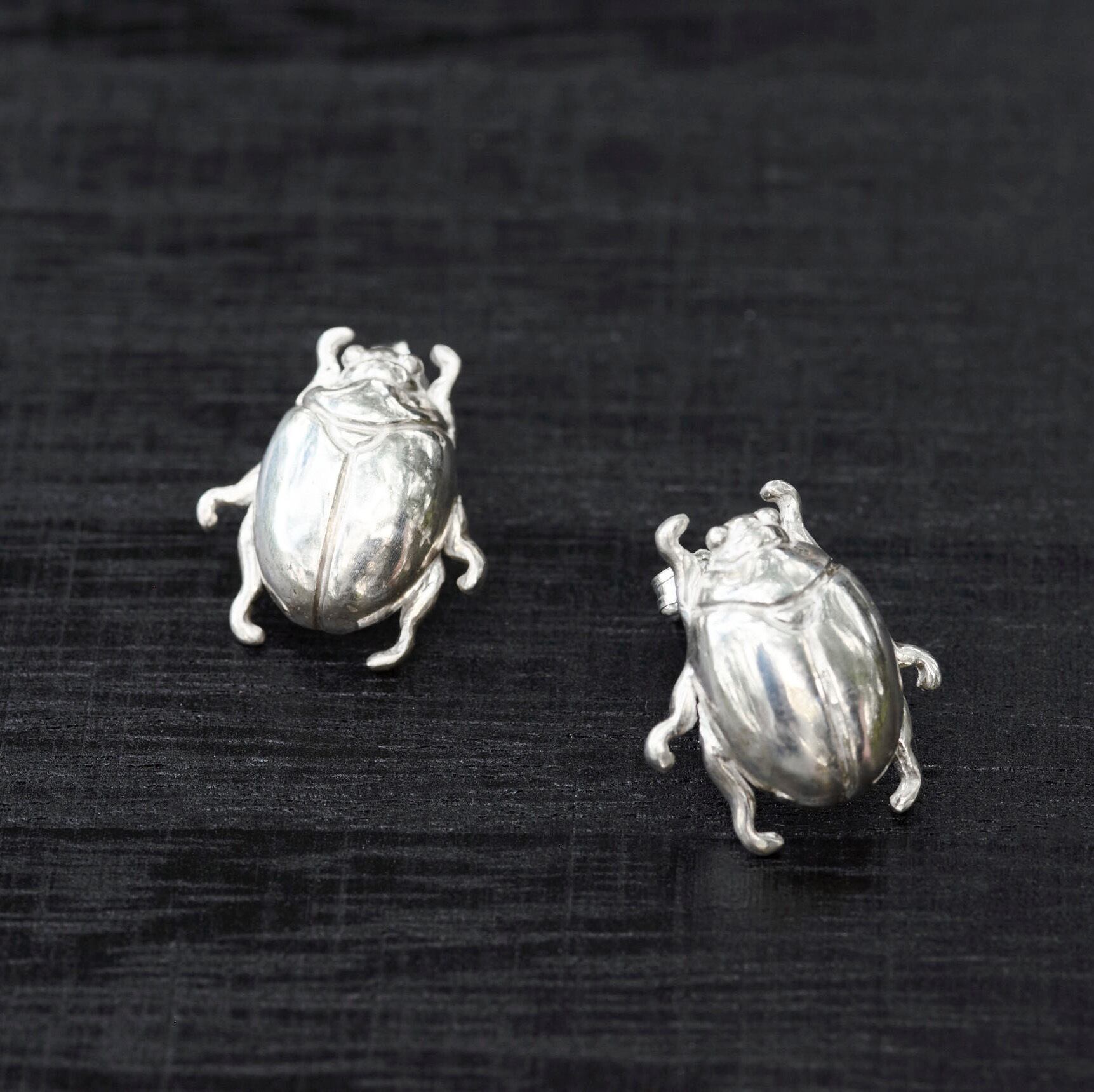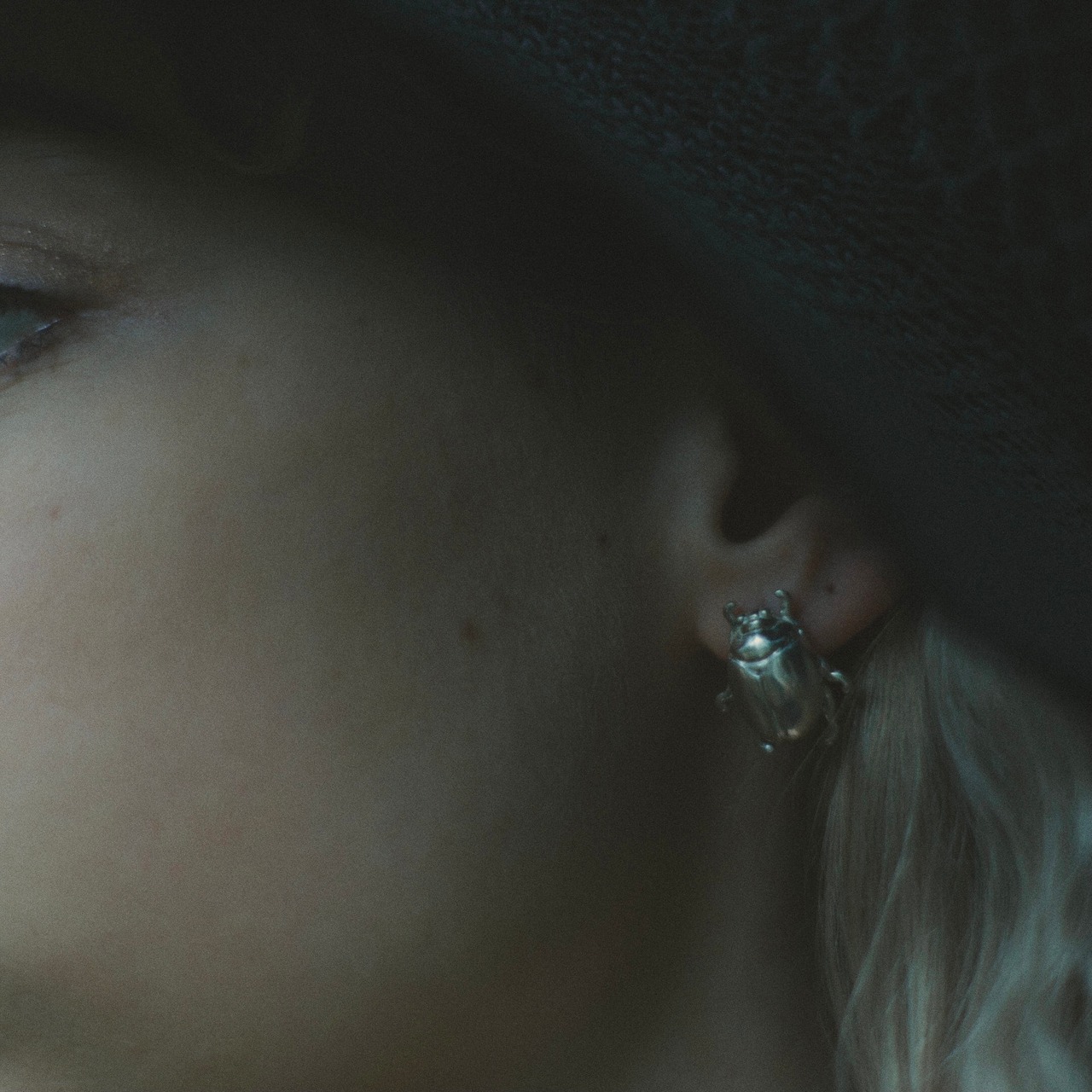 表面が丸くツルツルしているコガネムシのピアス。耳にコガネムシがとまっているかのように見えます。