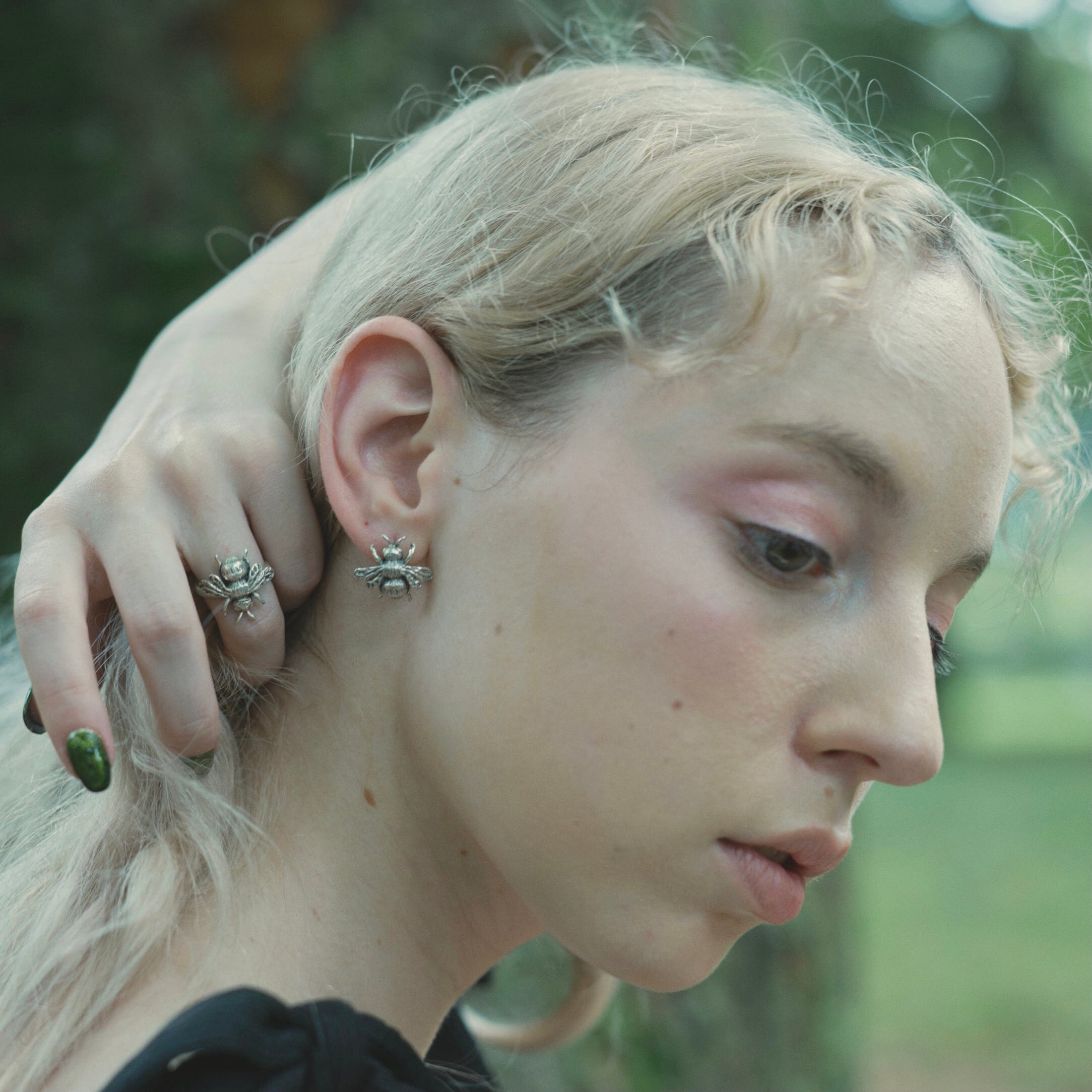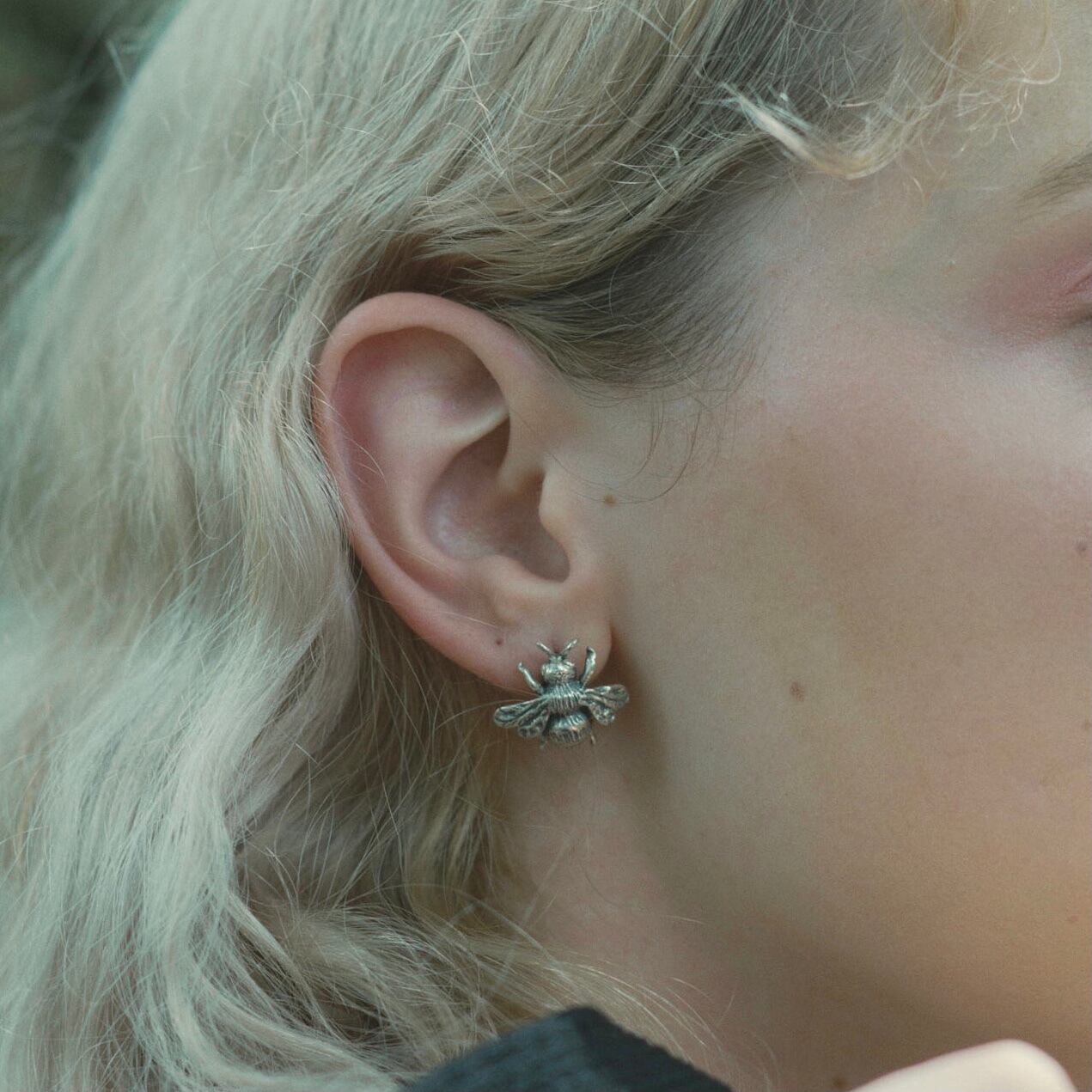 蜂がとまっているかのように見え、耳に馴染むように蜂の体が耳たぶ側に沿っています。いぶし加工をしていますので凹の部分が黒くなりヴィンテージ風になっております。