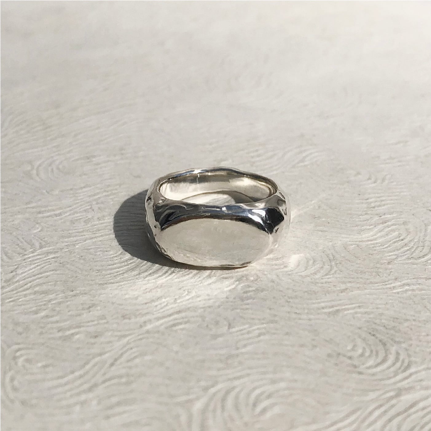 サイドはボコボコしていて、前はツルッと平らな印台リング。